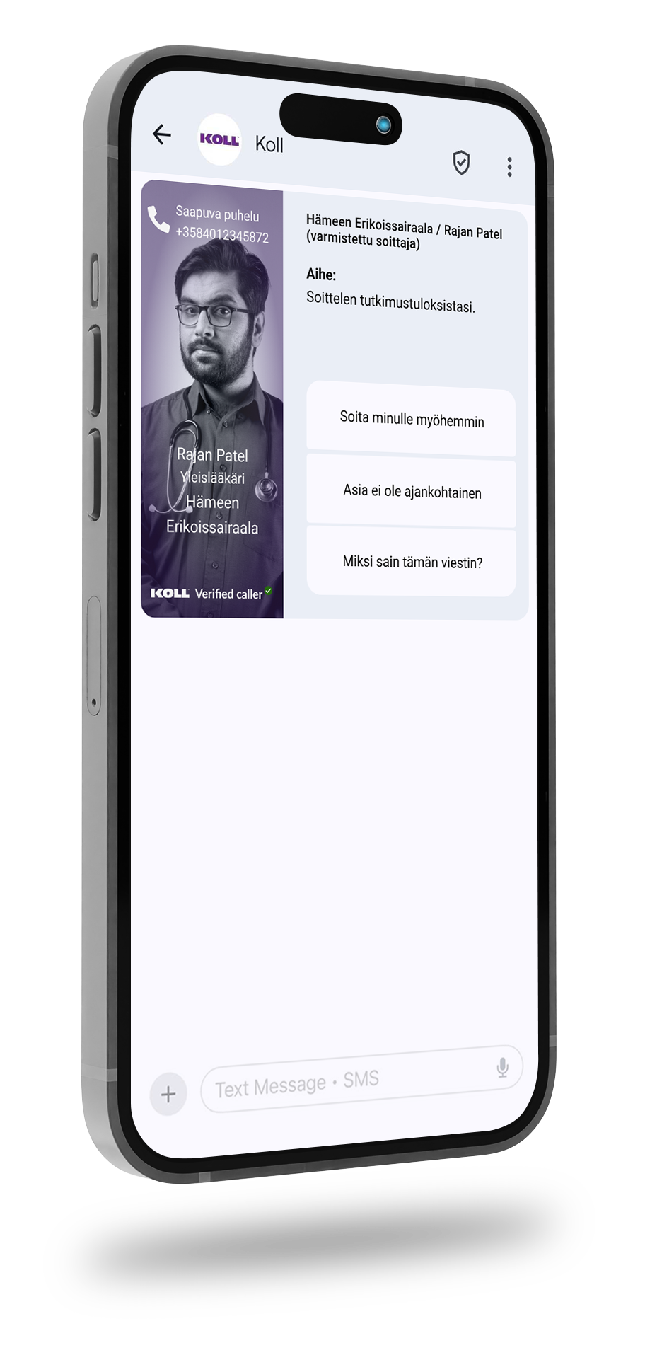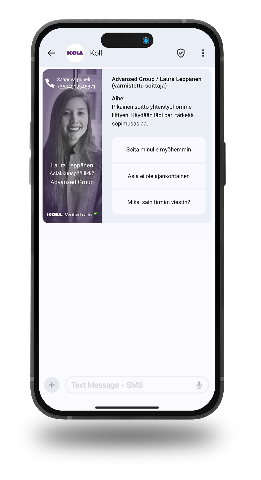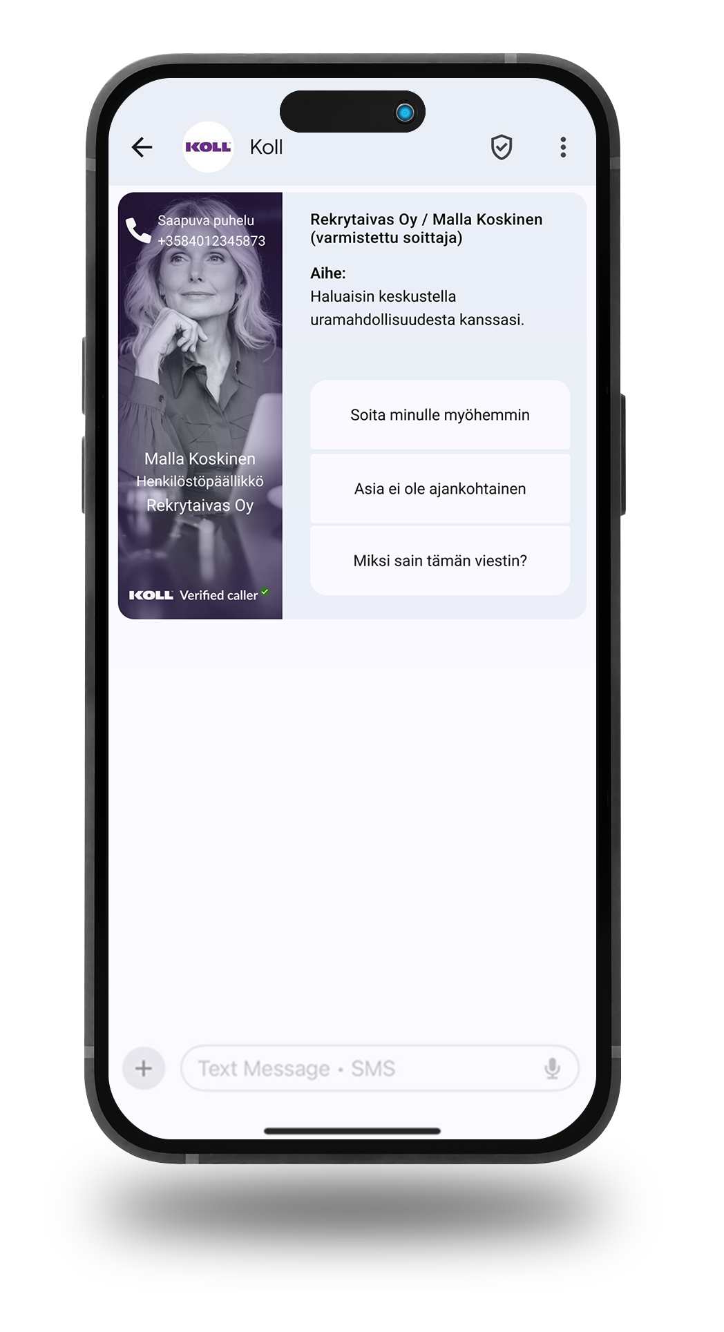 Koll näyttää soittajan tiedot ja soiton syyn jokaisessa puhelussa. Toimii 100% mihin tahansa mobiilinumeroon soitettaessa.
