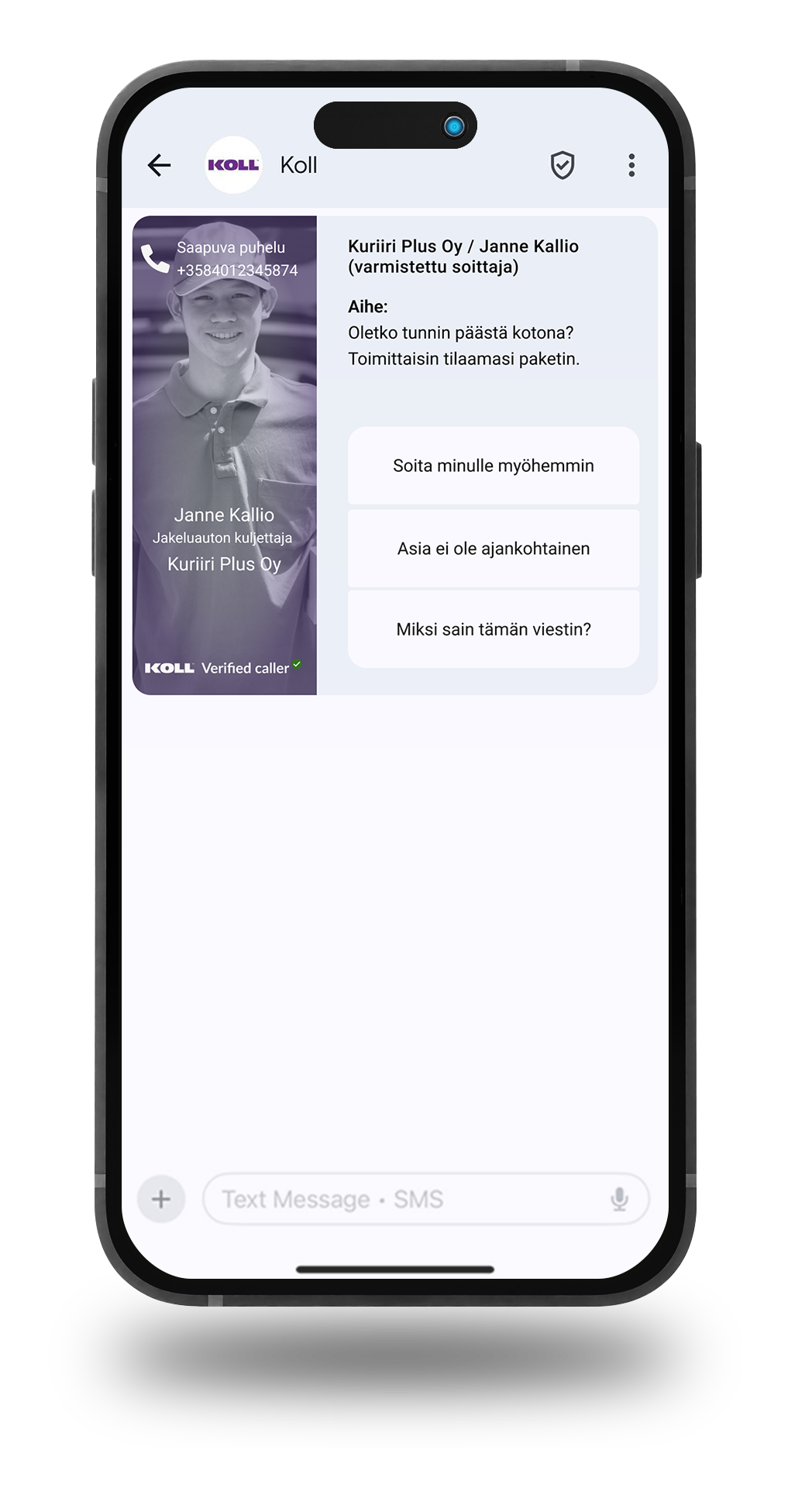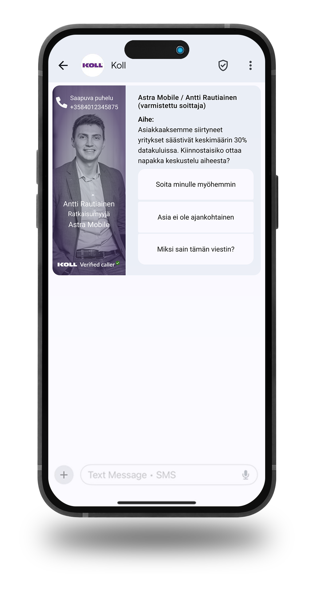 Koll on puheluiden uusi standardi, jonka käyttäjiksi vastuulliset yritykset siirtyvät. Tee päätös luopua vieraista puhelinnumeroista soittamisesta. Asiakkaasi, henkilöstösi ja tulosrivisi kiittävät.