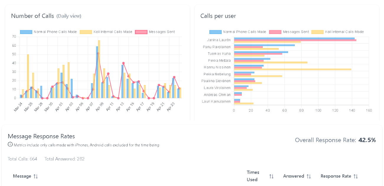 7. Näette puheluiden tilastot reaaliajassa Koll-hallintaportaalissa. Voitte reagoida nopeasti, jos yrityksenne viestit eivät resonoi kohderyhmän kanssa.